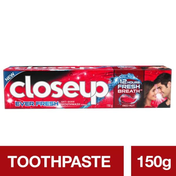 Closeup Everfresh+ Gel Toothpaste now in Triple Fresh Formula harnesses the combined power of 3 components – Anti-bacterial mouthwah, Purifying Gel and Natural Extracts of Tea Tree and Eucalyptus to keep your mouth clean, protected and fresh.